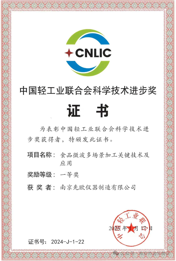 南京先歐儀器制造有限公司憑借其自主研發的食品微波多場景加工關鍵技術及應用項目,成功斬獲中國輕工業聯合會科學技術進步獎 [一等獎]。這一殊榮是對南京先歐儀器在科學儀器領域持續創新、技術攻堅成果的權威肯定,標志著公司在推動輕工行業技術進步方面邁出了堅實一步。